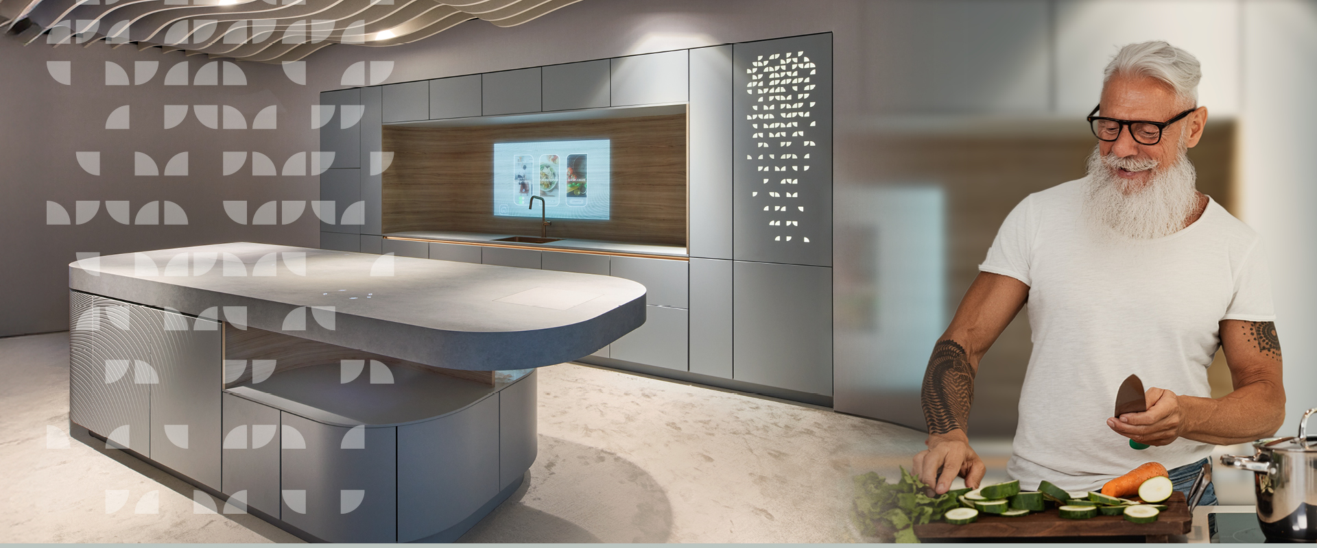 Künstliche Intelligenz sorgt nicht nur für mehr Sicherheit, sondern leistet darüber hinaus zudem einen wertvollen Beitrag für mehr Gesundheit im Alltag. Die installierten Kameras erkennen Gerichte und Zutaten, die sich auf der Arbeitsplatte befinden und zeigen Nährstoffe und Kalorien auf dem in der Küchen-Nische platzierten Bildschirm an.